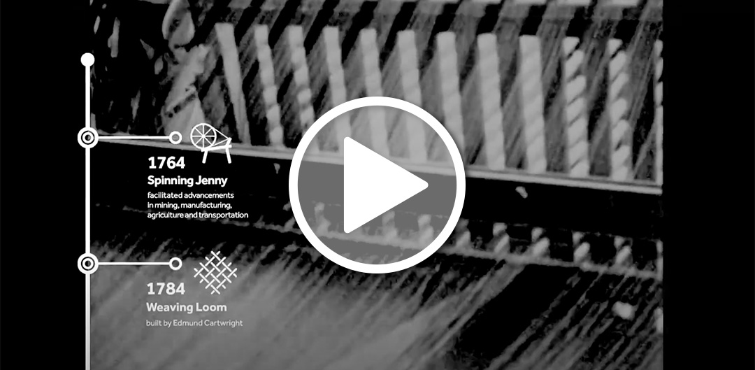 Welcome to America Makes welcomes guests and shows the progression of industrial revolutions and evolution of manufacturing.