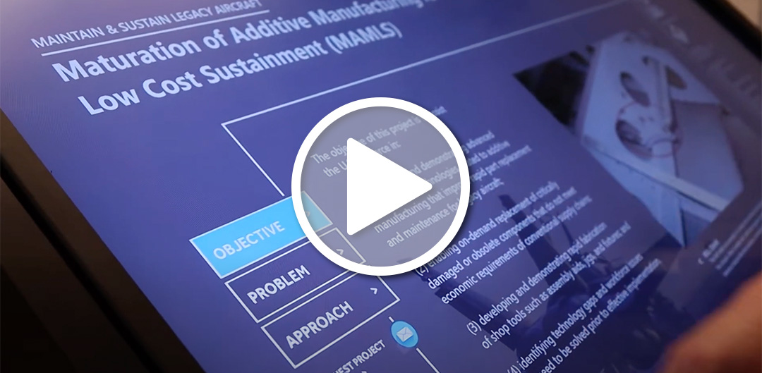 The national impact zone of the exhibit educates visitors on the tremendous impact both America Makes and additive manufacturing are having on the landscape of America. An introductory video is played before guests have the opportunity to navigate through several recent projects through touch-screen technology. After watching the short video on how America Makes has accelerated the adoption of additive manufacturing, visitors navigate through projects on the interactive kiosk using touch-screen technology. The first interactive projects we featured had nationwide, impactful objectives like maintaining and sustaining legacy aircraft for the U.S. Air Force, developing and validating a prototype digital AM supply chain for the U.S. Army and Department of Defense Original Equipment Manufacturers, and creating a STEM talent pool to sustain U.S. competitive edge, global competitiveness, and economic security.